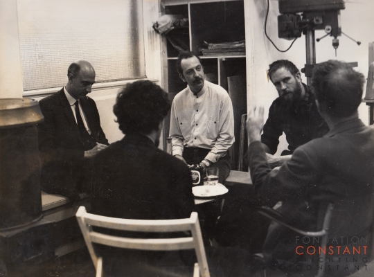 f.l.t.r.: Hein van Haren, Constant, Peter Clough, André Volten and Shamai Haber (seen from the back) in Constant's studio Wittenburg.