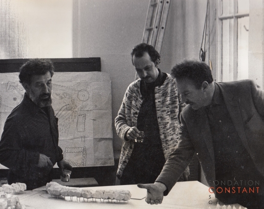 f.l.t.r.: Shamai Haber, Constant and André Volten working on the maquette Woestijnproject. Design for the Evoluon square Eindhoven.