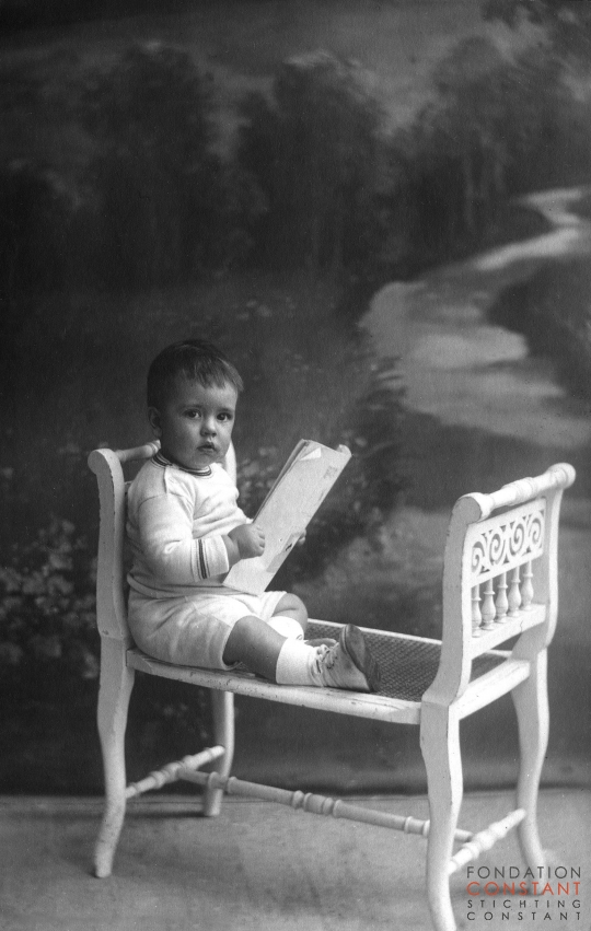 According to Constant the photographer had given him a teddy bear and a dinky toy to pose with. Constant had thrown both toys in the corner and pointed at a book. After the photographer had given it to him, he posed quietly for the photo.