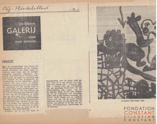 Review in Het Algemeen Handelsblad by the editor of the exhibition CONSTANT 1945 | 1965 at Gallery Krikhaar from January 2 till February 2, 1965.