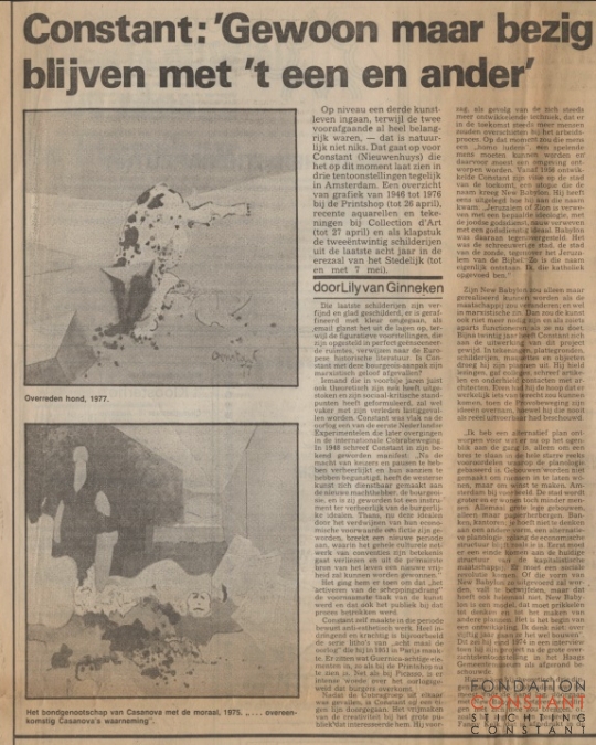 Article by Lily van Ginneken on three exhibitions with Constant's work in Amsterdam in 1978: Aquarellen en tekeningen at Galerie d'Art, Schilderijen 1969-77 at Stedelijk Museum and Constant | Grafiek at Printshop Piet Clement.