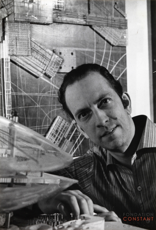 Constant in his studio with Spatiovore and Groep sectoren, Henri Polaklaan 25, Amsterdam, 1960.