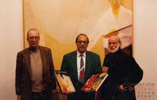 Constant, Jean-Clarence Lambert and Corneille in front of Autoportrait. Jean-Clarence Lambert is holding Constant. Les trois espaces and a book about Corneille. At the exhibition at Gallery Daniel Gervis, accompanying the presentation of his first book Les Trois Espace published by Cercle D'Art and presented at Campus Point Art in Château de Montvillargenne in Paris.