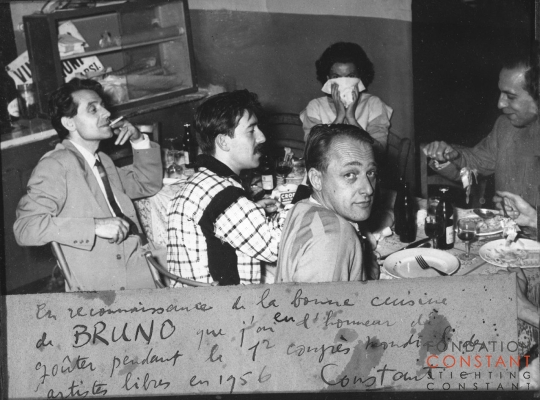 Fltr: Ettore Sottsas, Gil Wolman, Elena Verona, Asger Jorn and Constant at restaurant Bruno during the congress Mouvement pour un Bauhaus imaginiste in Alba 1956.
