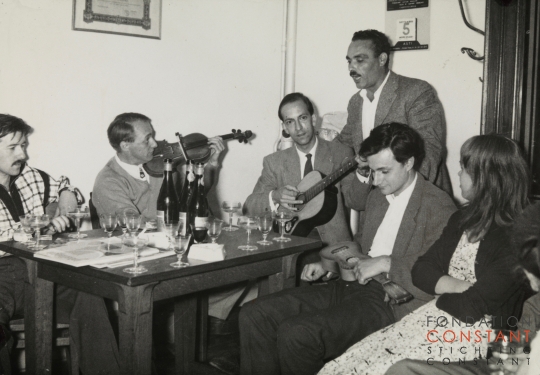 Gil Wolman, Asger Jorn, Constant, Bruno and Calonne in restaurant Bruno, 1956