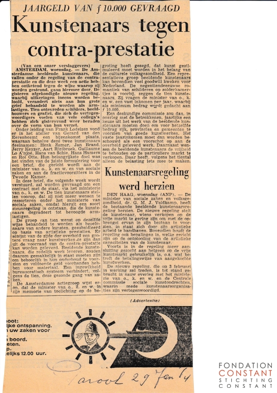 Article regarding the renewed social art regulation for visual artists, the so-called 'tegenprestatieregeling'.