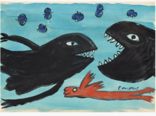 Misattribution. Gouache, signed Constant, bottom right, no year. We have no reasons to believe this work was made by Constant (1920-2005). The style is so divergent from Constant's work that it looks like a misattribution. The gouache was offered at an German auction and subsequently withdrawn after we informed them of the status of the work. We have no idea of the whereabouts of the work.