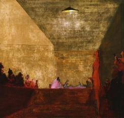 After working on New Babylon for about fiften years Constant Nieuwenhuys returns to painting, watercoloring and graphic work in 1969. After the large New Babylon exhibition in the Gemeentemuseum The Hague (now Kunstmuseum) in 1974 he sells the bulk of the project to the museum, cleans out his studio, buys art supplies and starts painting again. Nevertheless, the architectural structures can be seen throughout his work till far in to the seventies. Gradually Constant is inspired by everyday news, like the war in Vietnam, famine in Africa and refugees in Kosovo. His work starts to show a more personal engagement with the world. Marxism remains a big influence in Constant's work. He is being criticized for returning to painting at a time when art trends dictate that painting is passé as an art medium. Rudi Fuchs says the following on the subject in his foreword for the catalogue of Constant's paintings in 1995: Some consider Constant's return to painting a return to tradition. I, however, do not share this opinion. I consider his development from the seventies as a deeper penetration into the garden of painting.